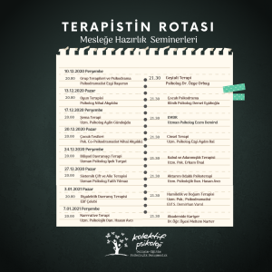 Terapist olmak uzun ve zorlu bir yolculuktur. Bu yolculukta, hangi ekollere ilgi duyduğunuzu, çocuk, ergen veya yetişkin alanlarının hangisinde çalışmak istediğinizi belirleyebilmek ve mesleki gelişiminizde daha sağlıklı bir rota çıkarabilmek için çalışma alanlarını ve terapi ekollerini yakından tanıtmak amacıyla açılan seminer programıdır. Terapi yaklaşımlarının ve kariyer planında size yol gösterecek konuların ele alınacağını program 10 Aralık tarihinde başlayacaktır.